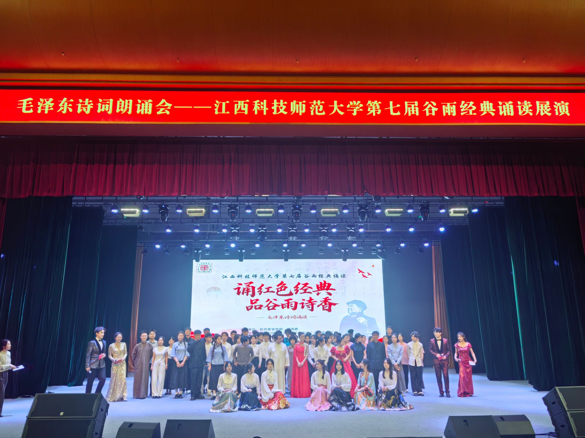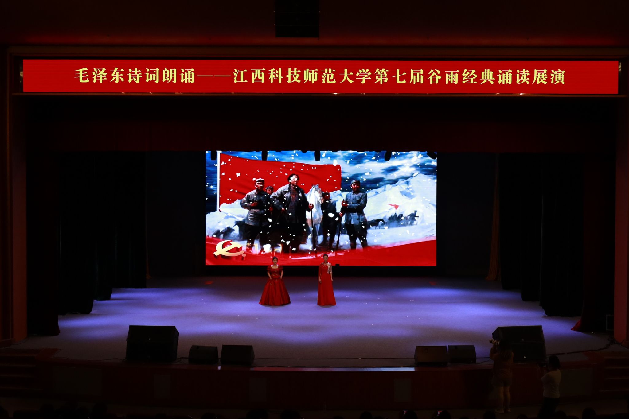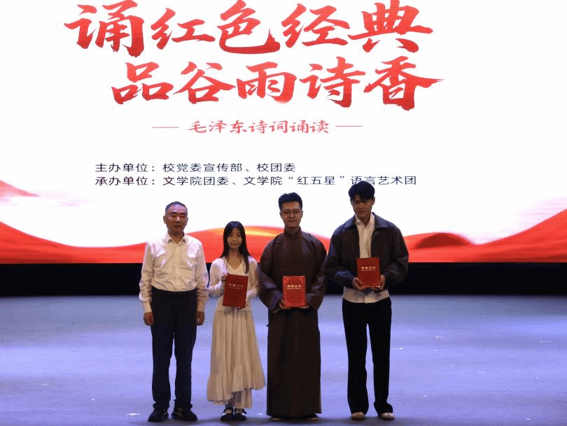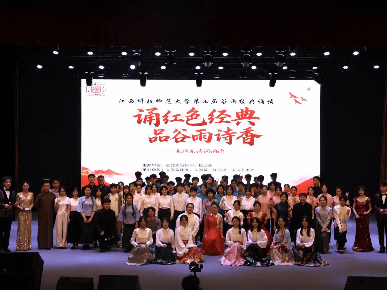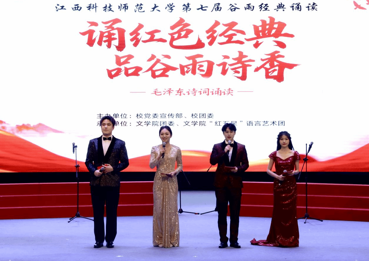 诵读红色经典,赓续红色血脉。4月20日晚,毛泽东诗词朗诵会——第七届谷雨经典诵读展演在红角洲校区红五星报告厅举行。校党委副书记刘国云,校党委委员、宣传部部长余玉荣,江西省朗诵与语言艺术协会常务副会长兼秘书长刘海涛与现场千余名师生共同诵读毛泽东诗词,感受红色经典。