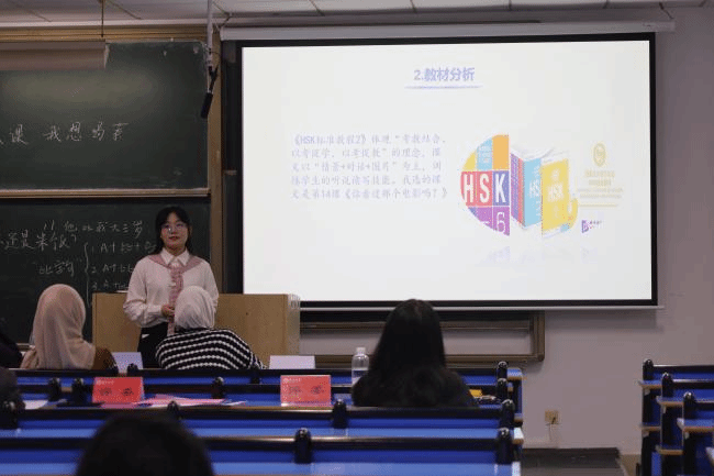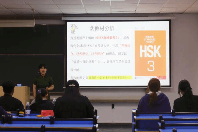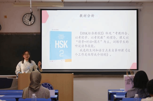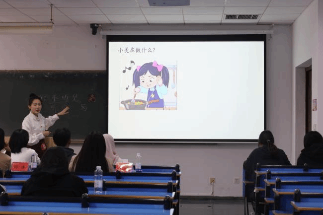 决赛现场竞争激烈,我院选手在万书言老师的指导下沉着应战。教学展示设说课、片段教学两大环节,WilliamHill威廉希尔参赛选手们以《HSK标准教程》为依托,创新设计互动课堂,借助多媒体课件特殊设计、情景对话等形式,将语言知识点与中国文化元素巧妙融合,课堂氛围生动鲜活,赢得评委一致好评。中华才艺展示环节,选手通过快板、古筝、中国舞等表演,将文化融入教学,彰显中华优秀传统文化的跨文化传播力。