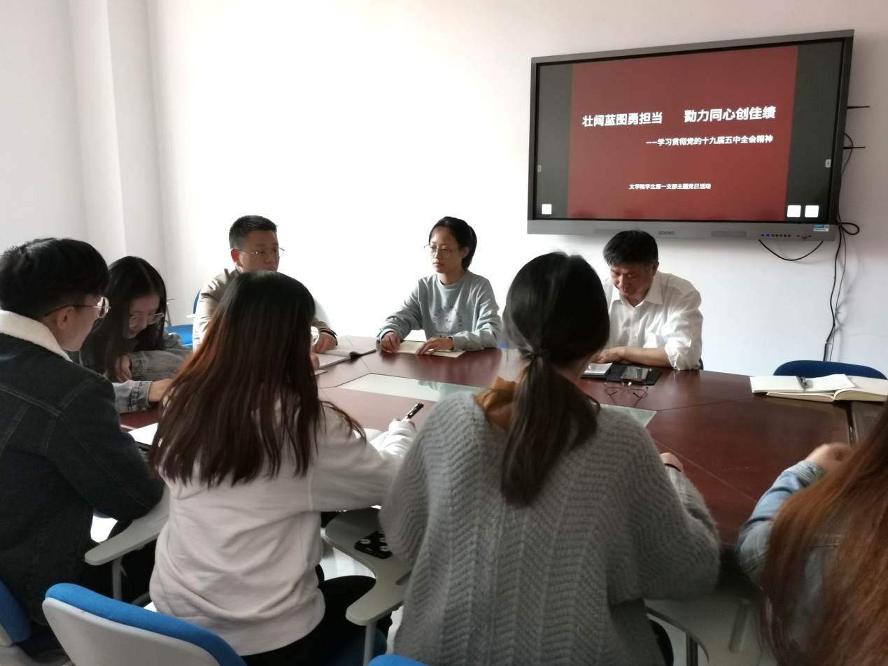 “壮阔蓝图勇担当,戮力同心创佳绩”。2020年11月12日下午3点,红角洲校区文科楼W1301教室,WilliamHill威廉希尔学生第一支部开展了一场别开生面的学习贯彻党的十九届五中全会精神主题党日活动。活动由WilliamHill威廉希尔学生第一支部书记肖放亮主持,副校长胡业华、学生第一支部全体党员参与。