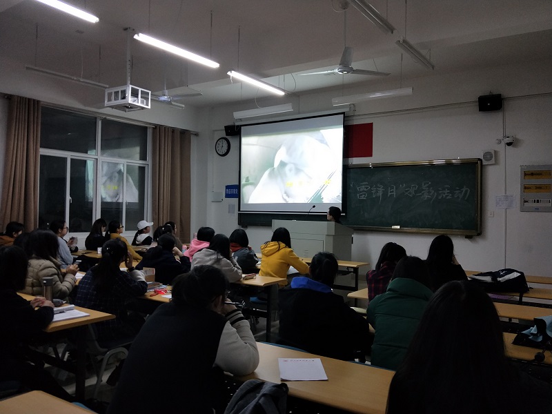 晚七点,电影《离开雷锋的日子》正式开始放映。在放映过程中,同学们目不转睛地盯着幕布观看,并渐渐地为甘于奉献的“雷锋精神”所吸引。这部电影讲述了雷锋的感人事迹以及乔安山学习雷锋做好事的感人故事。“人的生命是有限的,但为人民服务是无限的,我要把有限的生命投入到无限的为人民服务当中去。”雷锋的话语深深的敲击着在场同学的心灵,更是燃起了同学们心中的助人热情,立志要发光发热,献出自己的青春力量。