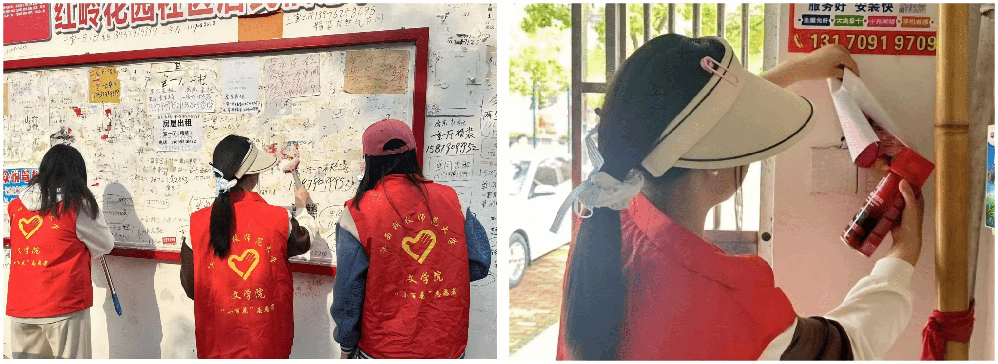 在红岭社区,学院党团志愿者们细致入微地清扫着每一条道路,耐心铲除社区公告栏和墙面上的一些小广告,为社区营造出一个干净、整洁、舒适的环境。同时,他们还主动向居民宣传环保知识,用真诚而热情的话语,呼吁大家携手共护我们美好的生活环境。