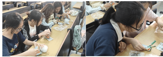 活动伊始,同学们便踏上了一段穿越时空的文化溯源之旅。团课首先深入探寻端午节的“双重起源”:一面是屈原于汨罗江畔以身殉国;另一面则是根植于古老吴越大地的祭龙祈愿活动。端午节寄托着中华民族的深沉情感,直至今日,它已成为世界瞩目的非物质文化遗产。团课带领大家品味了端午传统习俗。一枚小小的粽子,饱含百姓对屈原的深切缅怀与护佑之心。而百舸争流的龙舟竞渡,则彰显团队协作、扬帆起航的精神。本次活动浓墨重彩的一笔,落在了“戴香囊”这一端午节不可或缺的习俗上,其内蕴的艾叶、雄黄等药材能驱邪避疫,护佑安康,成为人们表达情感的纽带,传递祝福与关爱。理论学习之后,活动迎来了最富乐趣的环节——亲手制作端午香囊。在精心指导下,同学们兴致盎然地投入到这项传统手工艺中,一针一线地缝制出香囊雏形,再以珠饰精心点缀。穿针引线的过程,不再仅仅是技巧的习得,更是与古人智慧、与民俗温度的深情对话,同学们对文化内涵的理解油然而生,许多同学更是在香囊上寄托爱国情怀,创作出独特的“爱国主题”作品。