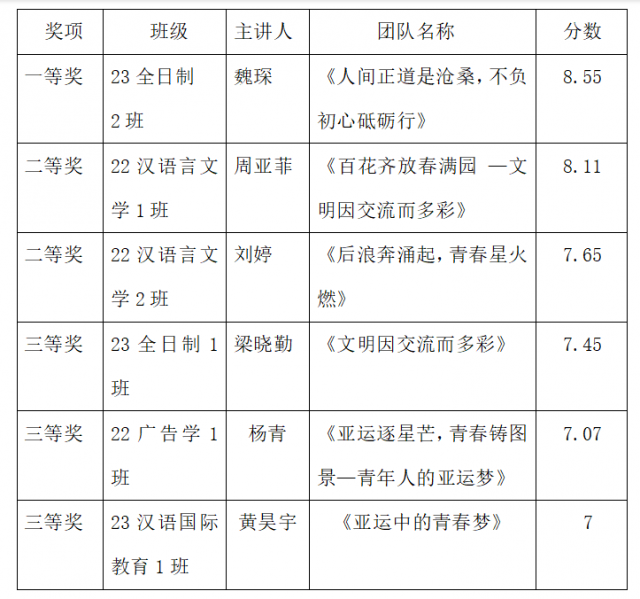 参赛选手们分别围绕“盛世中的青年担当”、“新时代的共青团员”、“坚定理想信念”和“倡导文明互鉴”等多个话题,从杭州亚运会热点赛事、身边感动人物、优秀传统文化、红色感人故事等多个角度切入。主讲人落落大方、侃侃而谈,或娓娓道来表达着对先锋模范的深切敬意,或慷慨激昂抒发着对泱泱华夏的热爱之情,又或情真意切唱响着报国为民的豪情壮志……