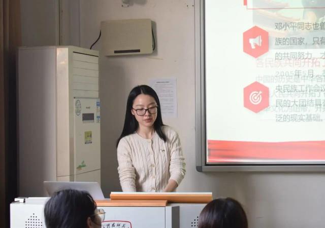 团课开始,团委老师吴泷先用几张图片作为引入,鼓励同学们积极参与回答,映入眼帘的是藏族那颜色鲜艳的服饰,是苗族那花纹多样的服饰,还有那让人垂涎欲滴的酥油饼。通过对少数民族服饰及特色美食的介绍,吴泷老师引出今日团课的主题--铸牢中华民族共同体意识。