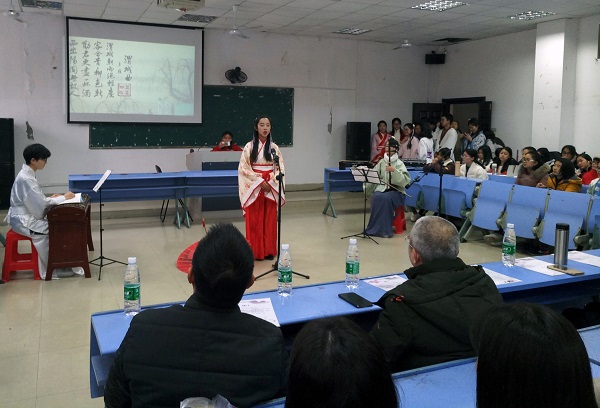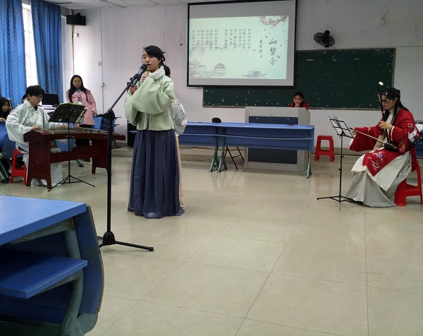 专项汇演伊始,身穿汉服的同学们依次登上舞台,从大漠孤雁塞北,到杏花春雨江南;从山水田园牧歌,到金戈铁马阳关,为大家吟唱一首又一首的名家大作——由徐雅茜、朱順香带来的《如梦令》,歌出了李清照“凄凄惨惨戚戚”的悲凉;徐勤、吴光强饱含壮烈之情唱出《满江红》,赢得掌声一片;而无论是《燕歌行》、《渭城曲》,还是《远别离》、《子夜吴歌》、《沁园春·雪》,悠扬吟唱,皆释放出我们的敬仰与自豪。