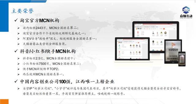 集团及旗下子公司目前经营着从电商到社交、从图文到短视频到直播、从传统品牌传播到互联网广告投放、从数字版权到IP孵化的数字经济领域内的众多版块,目前小红书MCN机构全国排名第二,抖音排名前十,公司员工1000余人,是江西省最大的民营互联网文化传媒类企业之一。