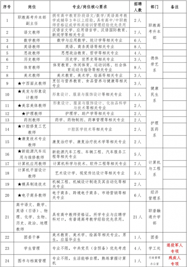 3.教学岗要求全日制本科及以上学历,所学专业对口;有企业经验(一般为3年以上)专业课教师(需求带★)岗位可放宽至大专学历。非教学岗全日制专科及以上学历。本校优秀毕业生专项中专以上学历。