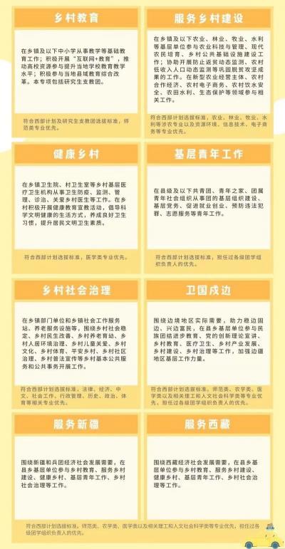 乡村教育、服务乡村建设健康乡村、基层青年工作乡村社会治理、卫国戍边、服务新疆、服务西藏8个专项。志愿者服务期为1至3年,服务协议一年一签。