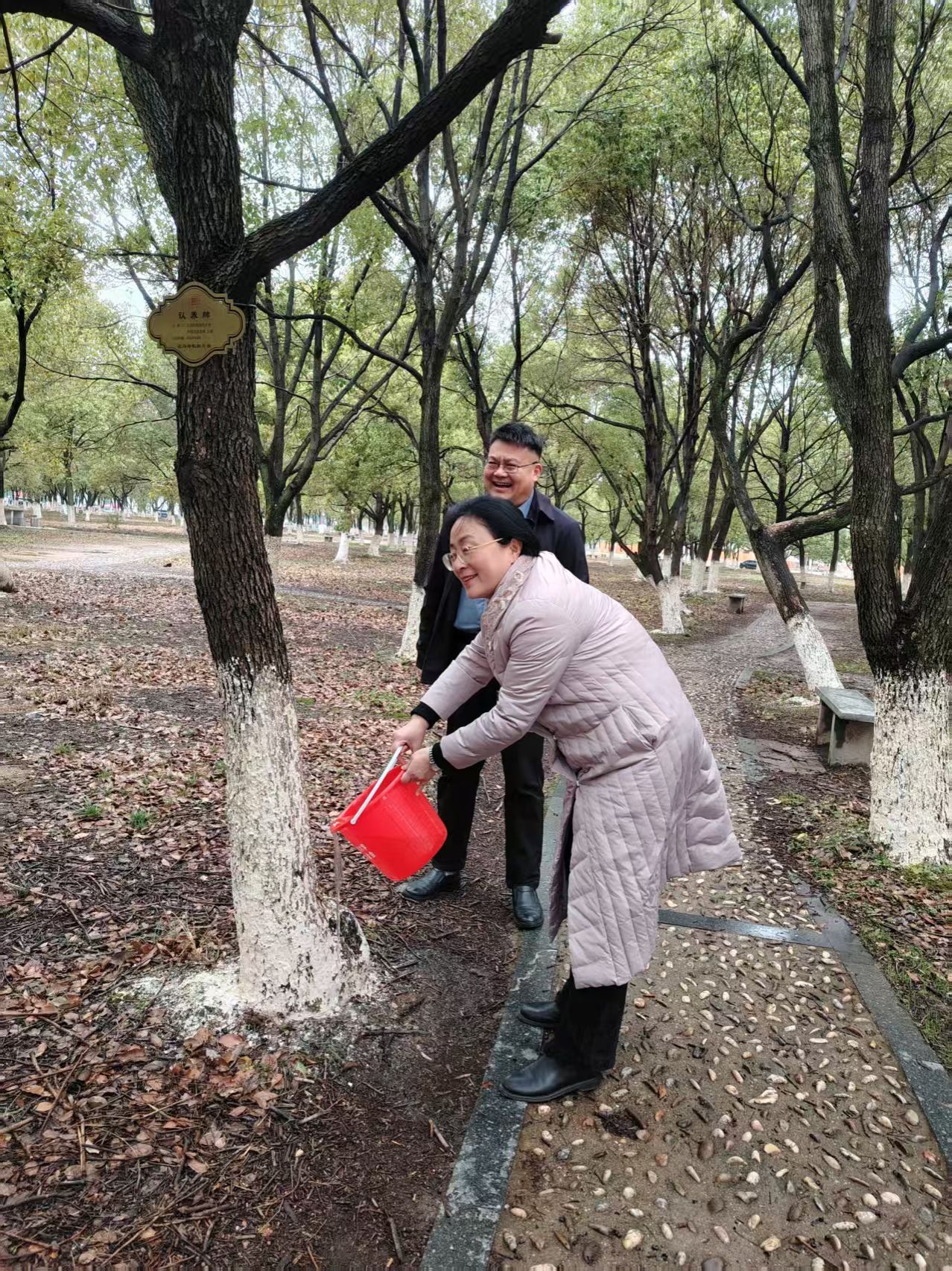 在刘飚陪同下,大师姐万瑛参观了学校校友林并为她认养的树木浇水,为母校献绿,表达感恩之情。