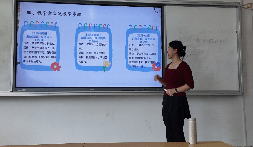 在教师说课试讲环节,参赛研究生从多个维度精心筹备,精彩呈现。选手们精准剖析了不同年龄段、文化背景学习者的特点与需求,设定了涵盖语言知识、技能培养及文化理解等方面清晰合理的教学目标。她们灵活运用情境教学、任务驱动等策略,激发学习者的兴趣,还将教学内容与江西文化巧妙融合,讲课特色鲜明,尽显专业素养。