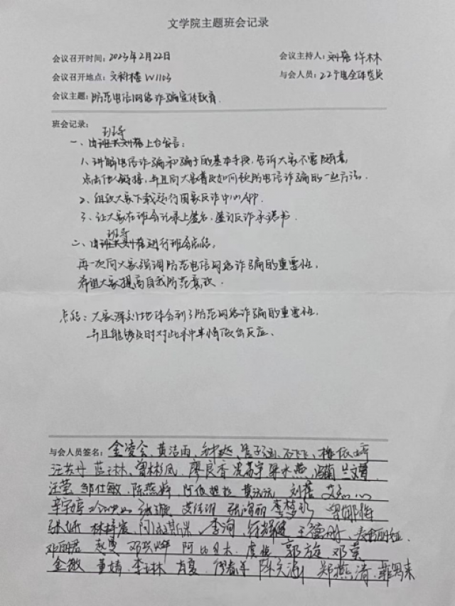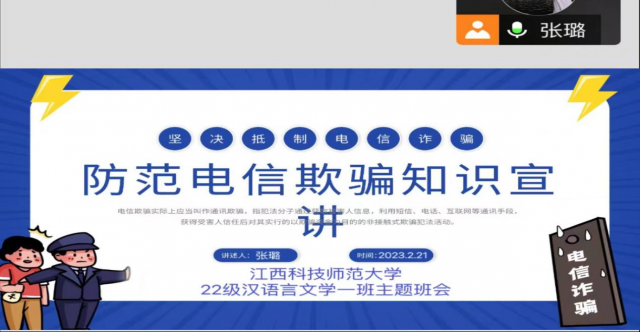 WilliamHill威廉希尔各班于2023年2月23日至2023年2月27日开展了“防范电信网络诈骗”主题班会,在班会活动中,同学们积极参加,使得防范校园诈骗活动获得了一定的成效,深化了法治教育,筑牢了师生的思想防线,有效防止了学生在知情或不知情的情况,直接或间接成为电信网络诈骗的“工具人”,切实提高学生防诈意识和反诈能力。