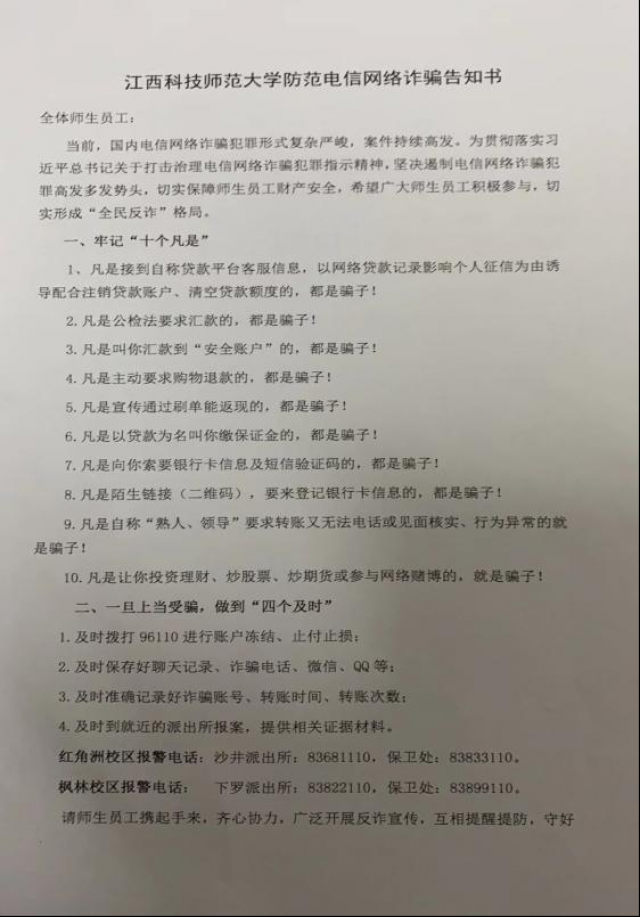 我校春季开学以来,已连续发生多起学生网上被骗案件,价值数万余元,学校发案情况多次被公安机关予以通报,防范典型网络诈骗被列为巡视整改重点工作。为尽快压降网诈案件频发势头,保障学生的财产安全,以及深入贯彻习近平总书记关于打击治理电信网络诈骗犯罪工作重要指示批示精神,认真落实省委巡视反馈意见整改工作,坚决遏制在校师生电信网络诈骗案件的发生,进一步提高广大学生的反诈意识和防范能力,我校各学院春季开学后要在全校师生当中深入开展一次防范电信网络诈骗专项宣传教育工作。
