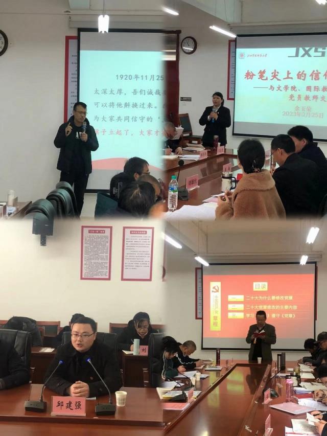 三是专家授课强理论。学院邀请校纪委调查科科长邱建强、校团委书记余玉荣、马克思主义学院副院长郜志刚、马克思主义学院副教授周国华等专家,为教工党员讲授了《夺取中国特色社会主义新胜利的政治宣言和行动纲领》《增强党员意识,争做一名优秀的共产党员》,带领大家学习了《中国共产党章程》、省委巡视反馈意见及省纪委包静同志的讲话和裴书记表态讲话等,推动教工党员学习贯彻党的二十大精神走深、走实。